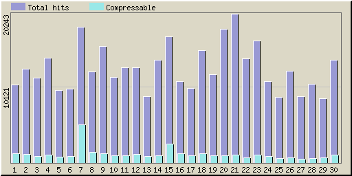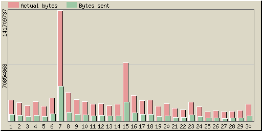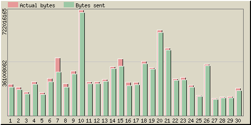 | Day | Hits | Actual bytes | Bytes sent | Saved bytes | Hits | Actual bytes | Bytes sent | Saved bytes |