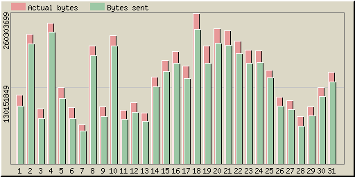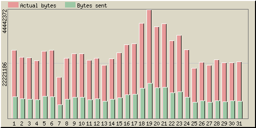 | Day | Hits | Actual bytes | Bytes sent | Saved bytes | Hits | Actual bytes | Bytes sent | Saved bytes |