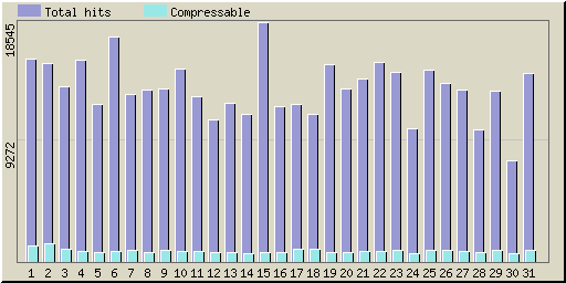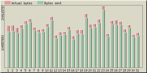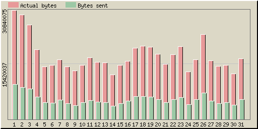 | Day | Hits | Actual bytes | Bytes sent | Saved bytes | Hits | Actual bytes | Bytes sent | Saved bytes |