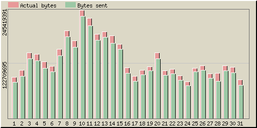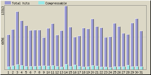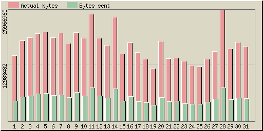 | Day | Hits | Actual bytes | Bytes sent | Saved bytes | Hits | Actual bytes | Bytes sent | Saved bytes |