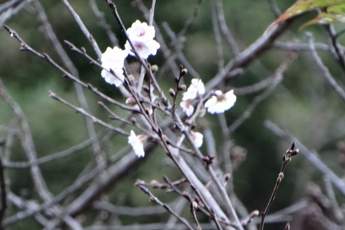 梅林脇の四季桜の並木では小さな桜の花が開いていた。