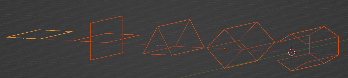 ボールが飛んでいくときの軌跡をポリゴンで描画したいのだけど、どんな形状にするかで悩んでる。以下のような形があり得るかなと思っているけれど、どれがいいのやら…。