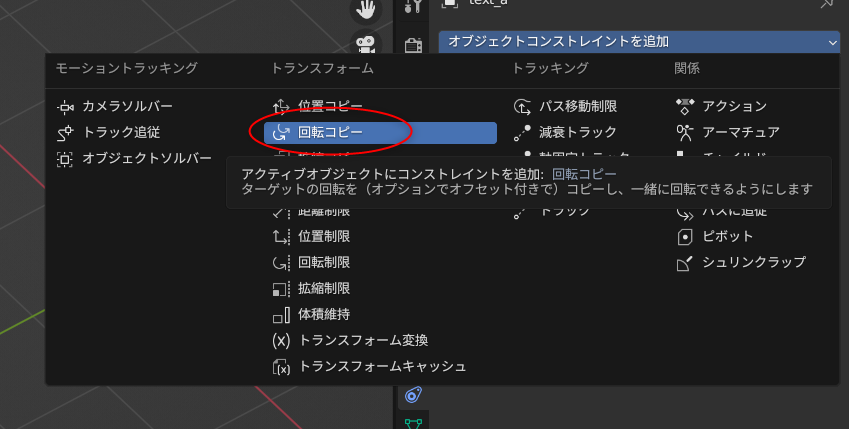 そんなことを考えながら、オブジェクトコンストレイントの種類を眺めていたら、「回転コピー」という種類があることに気づいた。ひょっとして、これを使えばいいのではないか。たぶん。