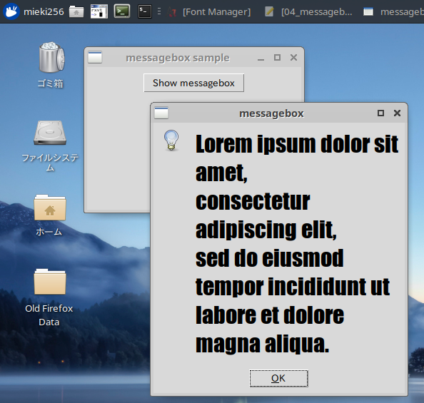 ただ、Windows と Mac はシステムダイアログを使ってるからフォントの変更はできないけれど Linux は独自ダイアログで messagebox を実現してるからフォント変更ができる、という話を見かけて、本当なのかなと気になってきた。