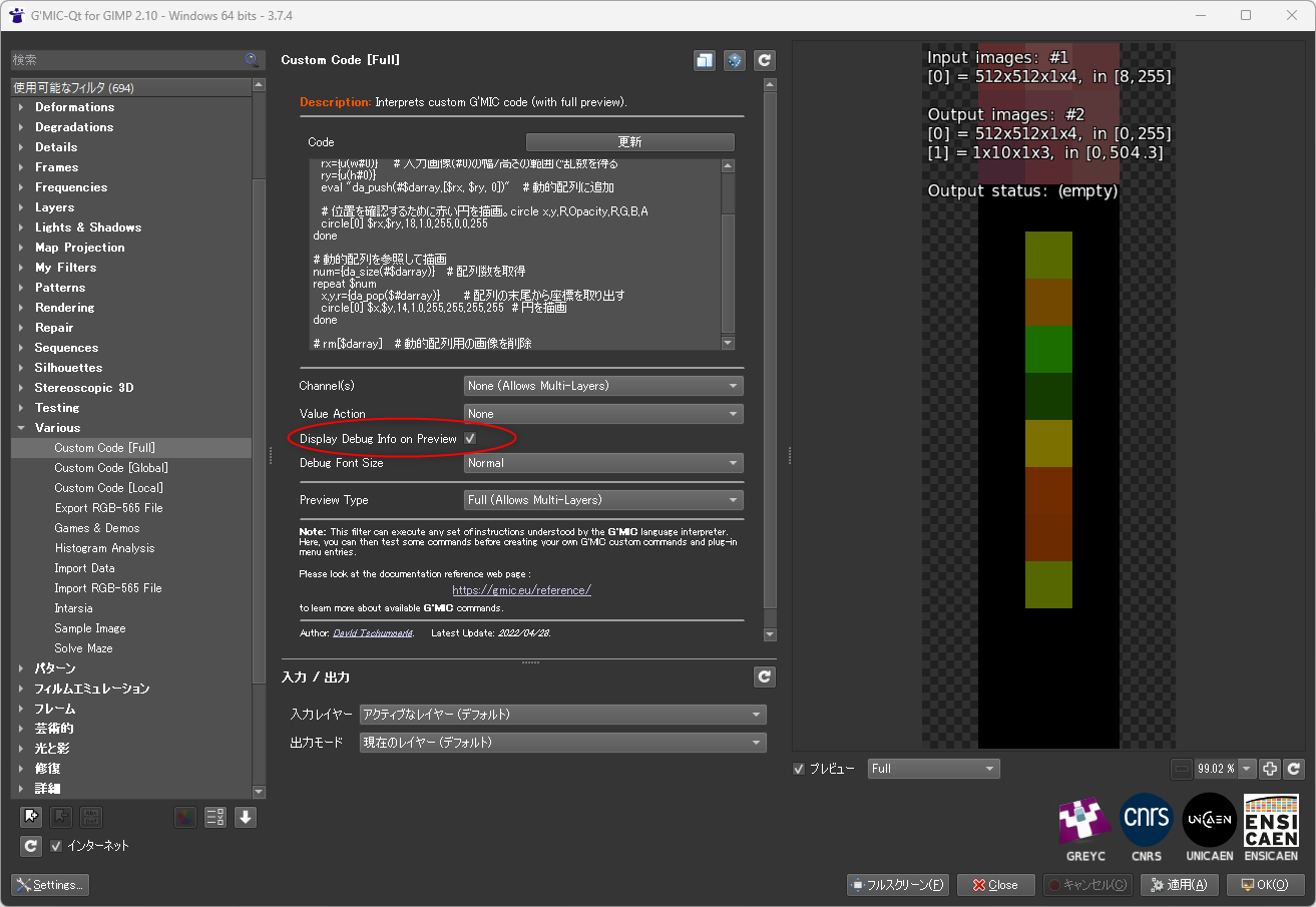 Various → Custom Code、にコピペして、Desplay Debug Info on Preview をOn/Offすれば、画像の中に値が格納されてる様子もなんとなく分かるかなと…。