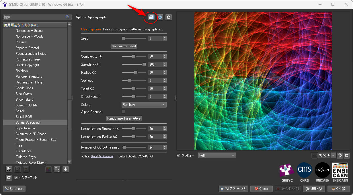 fx_spline_spirograph[-1] 0,0,50,200,74,6,50,{$>*0.5},8,0,0,50,50,1 # フィルタ処理
