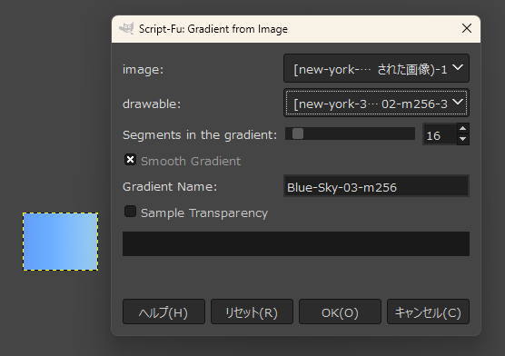 ただ、OKボタンを押すと、元画像を横方向のグラデーション画像に変換してくれるようではある。この画像からグラデーションファイル(.ggr)を作れたらいいのに…。