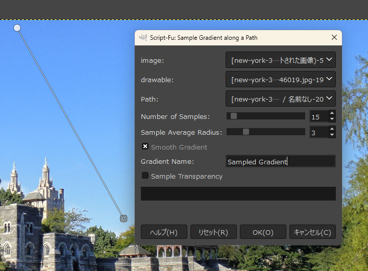 G'MIC の Gradient [from Line] は、サンプリングした各色の間を補間(?)してくれない模様。ガタガタしたグラデーションになってしまう。