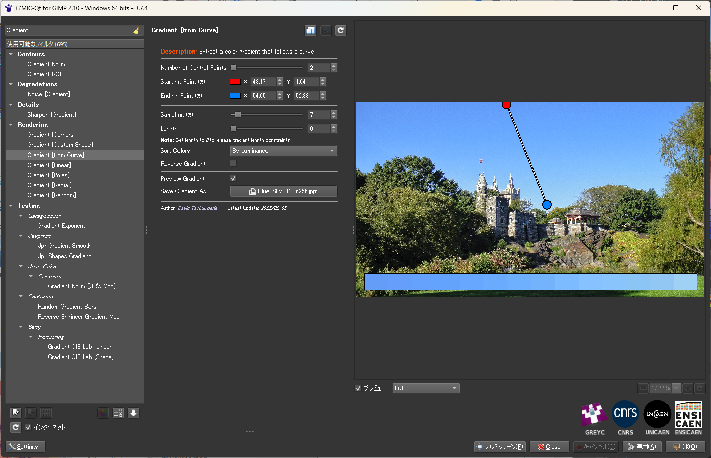 ちなみに、G'MIC の Gradient [from Curve] は、サンプリングした色を明度でソートして並び替えたりもできるので、一旦 G'MIC で綺麗なグラデーション画像を作成してから、Script-Fu でグラデーションファイル化するのもアリかもしれない。